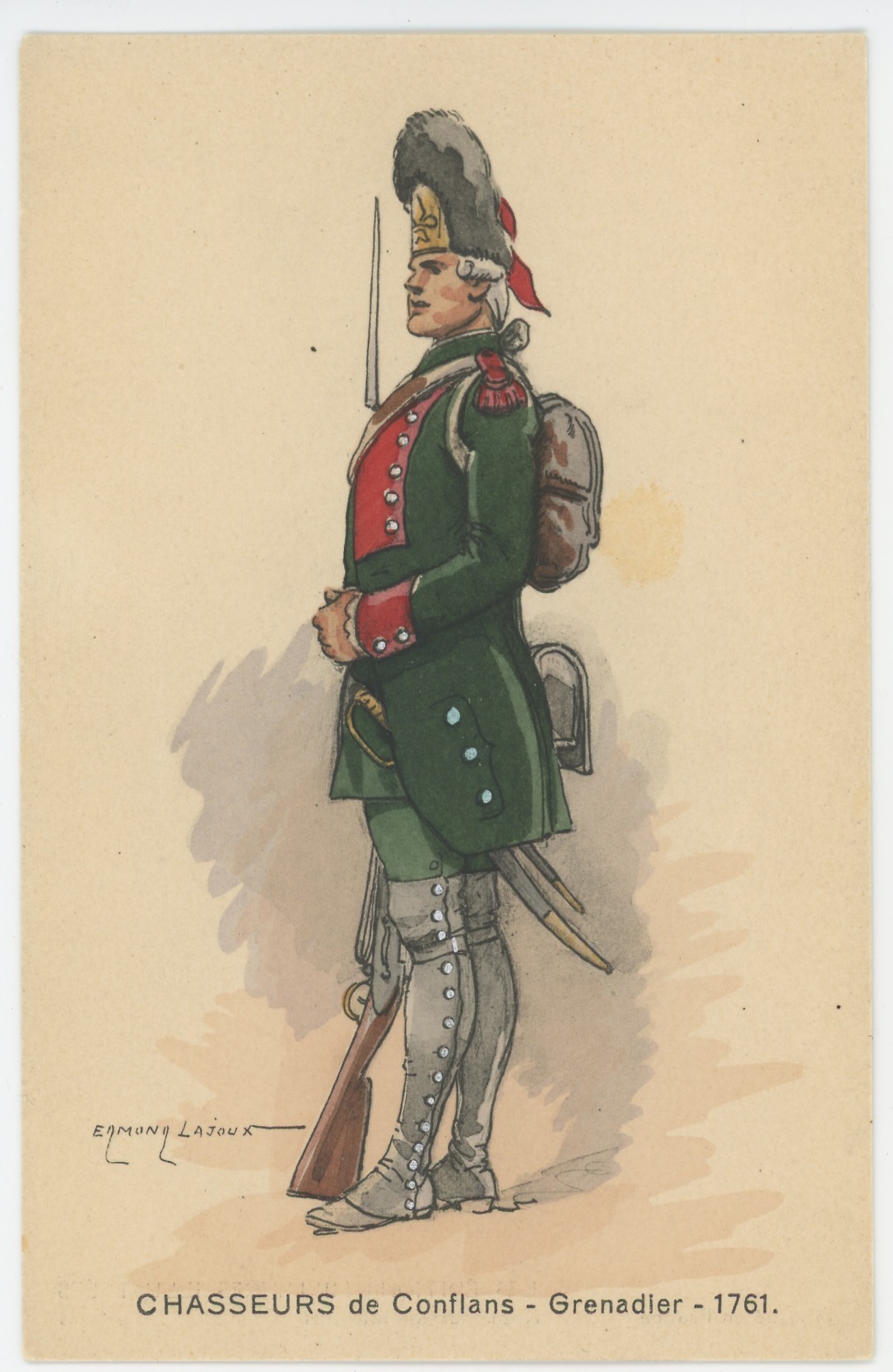 Carte Postale Illustrée – Edmond Lajoux – Edition Militaire Illustrées – Chasseurs de Conflans – Grenadier – 1761