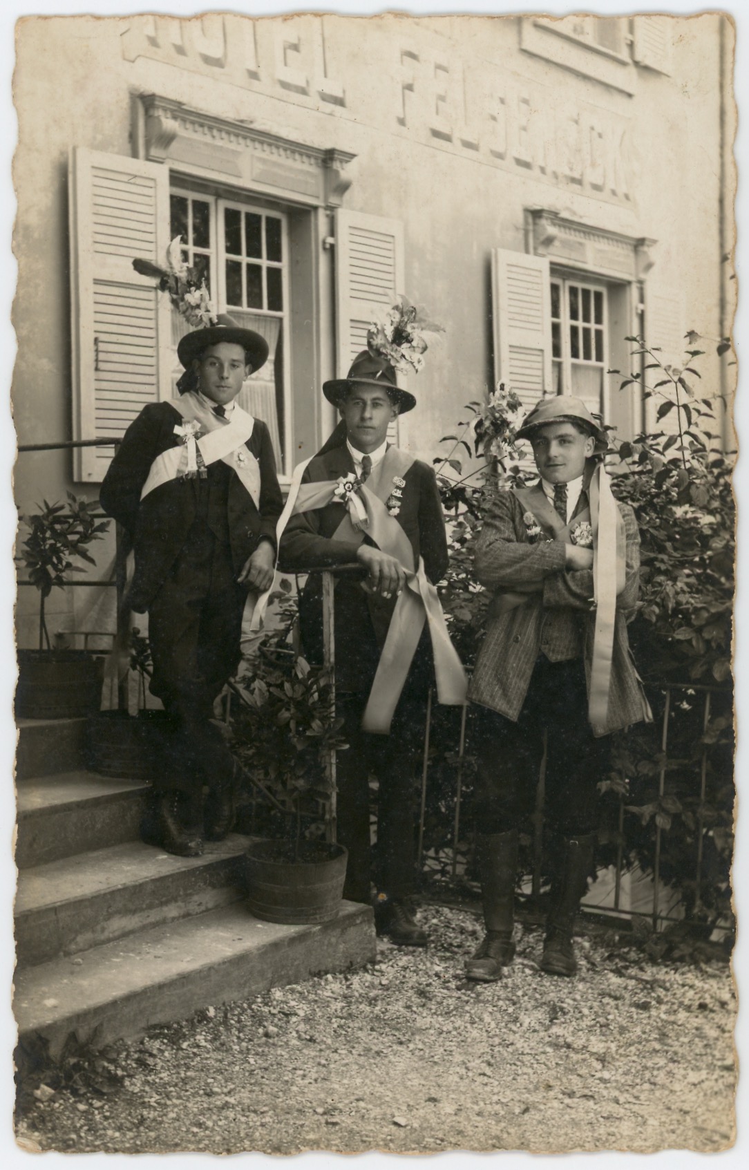 2 Cartes Photo papier originale – Conscription Classe 1927 – Conscrit militaire – Soldat – drapeau – Tirage au sort – Alsacien/Lorrain – Folklore