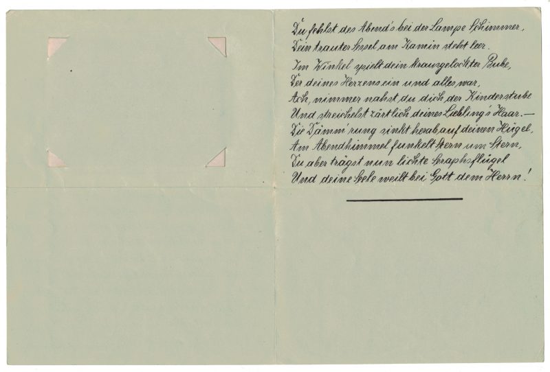 Photo letter – German soldier – War 14/18 – Mourning – Cemetery – Poem – Comrade – 1914 – 1915 Analog photography. Letter poem in German (approximate translation) On the back of the photo is indicated Auf dem Ehrenfriedhof von Kortewilde vor Ypern. Grabstätte Officer: H… Nawrath 2/99 At the Kortewilde Honorary Cemetery in front of Ypres. Officer Grave: H… Nawrath 2/99 1914/1915 “Now you sleep peacefully in a foreign land. Far from the homeland we bow to you. After the struggle and the trials and earthly complaints Sing for a better being You left the country too early From which there is no return And you warmly kissed yours And yet you loved life so much Your song is now silent in the Oriel Your warm voice no longer resonates You miss the glow of the evening lamp Your soft seat by the fireplace remains empty Your boy is playing in the corner Who was so dear to your heart You will never come to the children’s corner again And we won’t stroke your hair tenderly Twilight sings on the hill In the evening sky the stars twinkle But you now wear the clear wings of angels And your soul dwells near the Lord. “